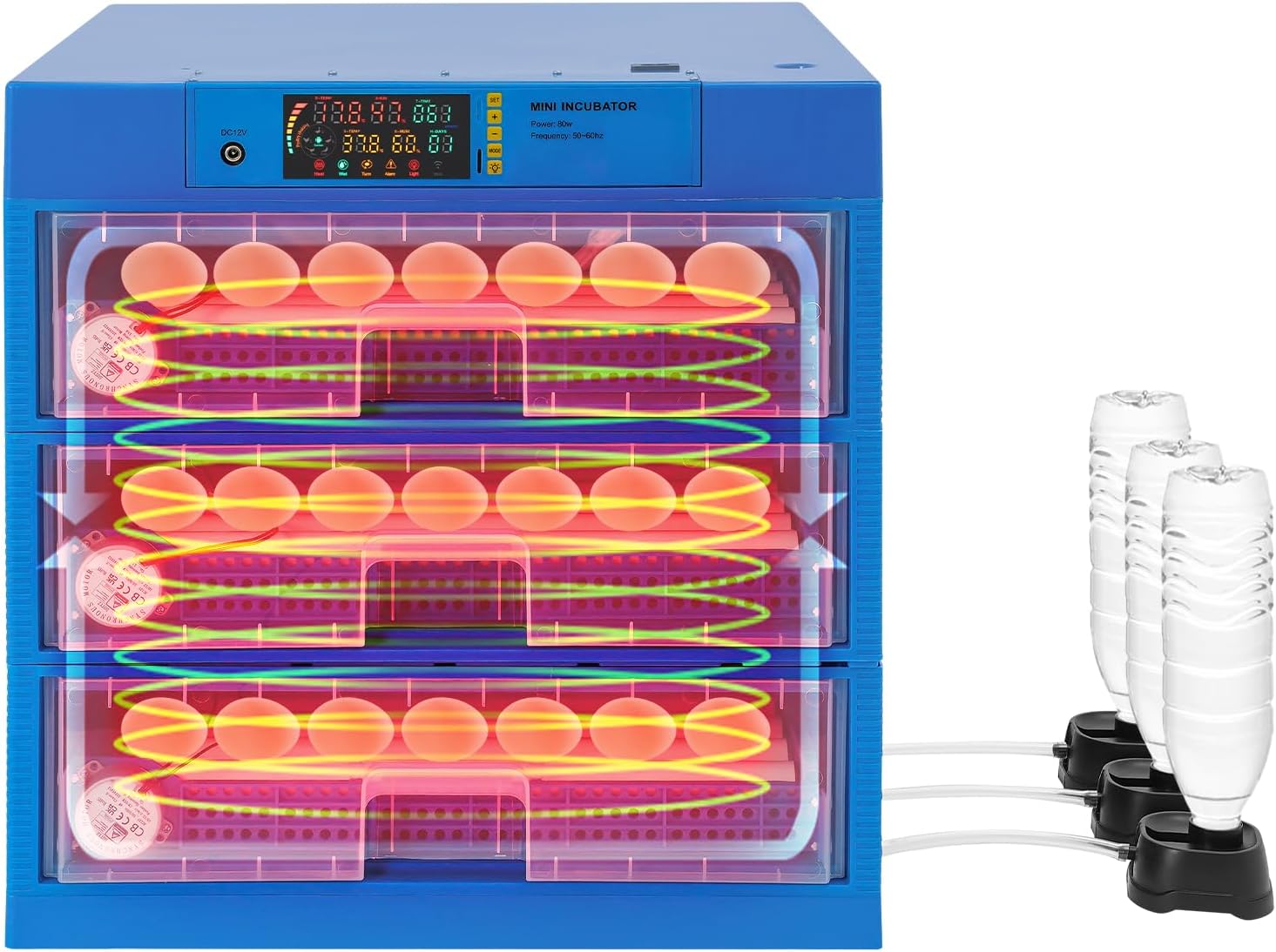 DetailsHigh Safety: The product has a dual-fan design to help the machine dissipate heat in time and improve the safety of use.Egg Lamp: By illuminating eggs with the light, you can always observe the development of breeding eggs and find spermless eggs and stunted weak eggs in time to improve the hatching rate.Foam Box: The foam box is insulated to make the egg incubator usable in winter.ApplicationThis product is suitable for hatching chicken eggs, duck eggs, goose eggs, dove eggs, pheasant eggs, etc. It is suitable for farmers, home use, educational activities, laboratory environments, and classrooms. SpecificationColor: BlueMaterial: PPDisplay Type: LEDMounting Type: TabletopPlug Type: US StandardPower Source: Corded ElectricPower: 80WVoltage: 110VFrequency: 50-60HzCapacity: About 200-240 Eggs (Depending on the Size of the Eggs)Temperature Range: 0-99℃/32-210.2℉Humidity Range: 0-99 % Power Cord Length: 1.8m/5.91 ftProduct Size: 52.3*50.3*62 cm/20.59*19.8*24.41 inPackage Size: 66*57.5*54.8 cm/25.98*22.64*21.57 in Gross Weight: 14.2 kg/31.31 lbsNet Weight: 13.49 kg/29.74 lbsPackage Included 1* Egg Incubator1* Power Cord1* English ManualOther Accessories for AssemblyNotes 1. The water bottle in the picture is for demonstration reference only, and the actual product does not come with a water bottle.2. The time for automatic egg turning is to turn the eggs every 2 hours. You can mark the eggs with a pen to check the egg turning operation.3. The shape of eggs used for hatching is very important, such as deformation, cracking, and abnormal shape, which are not suitable. Meanwhile, the selected eggs must be clean, and the eggs used for hatching cannot be washed with water.