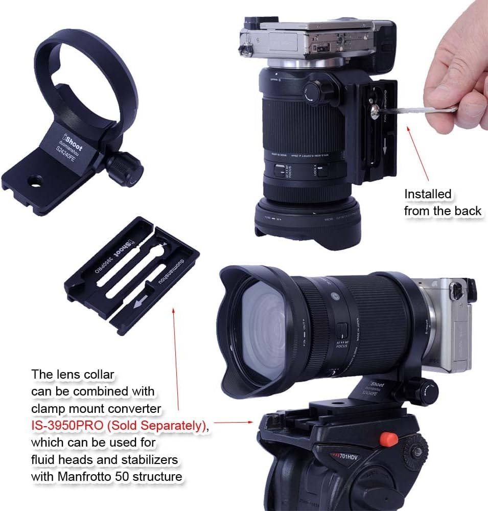 iShoot Lens Tripod Mount Ring Compatible with Sony FE 24-240mm f/3.5-6.3 OSS and other lens (see the below description), CNC Machined Lens Collar Support Bracket Holder, Bottom is ARCA Fit Quick Release Plate for Tripod Ball Head ARCA-SWISS Type Compatible with Sony Lens: FE 10-18mm F4 OSS FE 12-24mm F4 G FE 16-35mm F4 ZA OSS FE 16-35mm F2.8 GM FE 16-70mm F4 ZA OSS FE 18-105mm F4 G OSS PZ FE 18-135mm F3.5-5.6 OSS FE 24mm F1.4 GM FE 24-70mm F4 ZA OSS FE 24-70mm F2.8 GM FE 24-105mm F4 G OSS FE 24-240mm F3.5-6.3 OSS FE 28-70mm F3.5-5.6 OSS FE 35mm F1.4 ZA FE 50mm F1.4 ZA FE 50mm F2.8 Macro FE 85mm F1.4 GM FE 85mm F1.8 FE 90mm F2.8 Macro G OSS FE 100mm F2.8 STF GM OSS FE 100mm F2.8 Macro GM Compatible with Sigma Lens: 17-40mm F1.8 DC Art E-mount 14-24mm F2.8 DG DN Art E-mount 20-200mm F3.5-6.3 DG C E-mount 24-70mm F2.8 DG DN Art E-mount 24-70mm F2.8 DG DN Art II E-mount 28-45mm F1.8 DG DN Art E-mount 28-70mm F2.8 DG DN C E-mount 85mm F1.4 DG DN Art E-mount 105mm F2.8 DG DN Macro E-mount (Not compatible with Sigma 28-70mm f/2.8 DG DN Art) Cannot be used with L-mount lens Package Includes: 1 x iShoot Tripod Mount Ring IS-S24240FE Note: The other items in the photos not listed here are for illustrating only, not included.