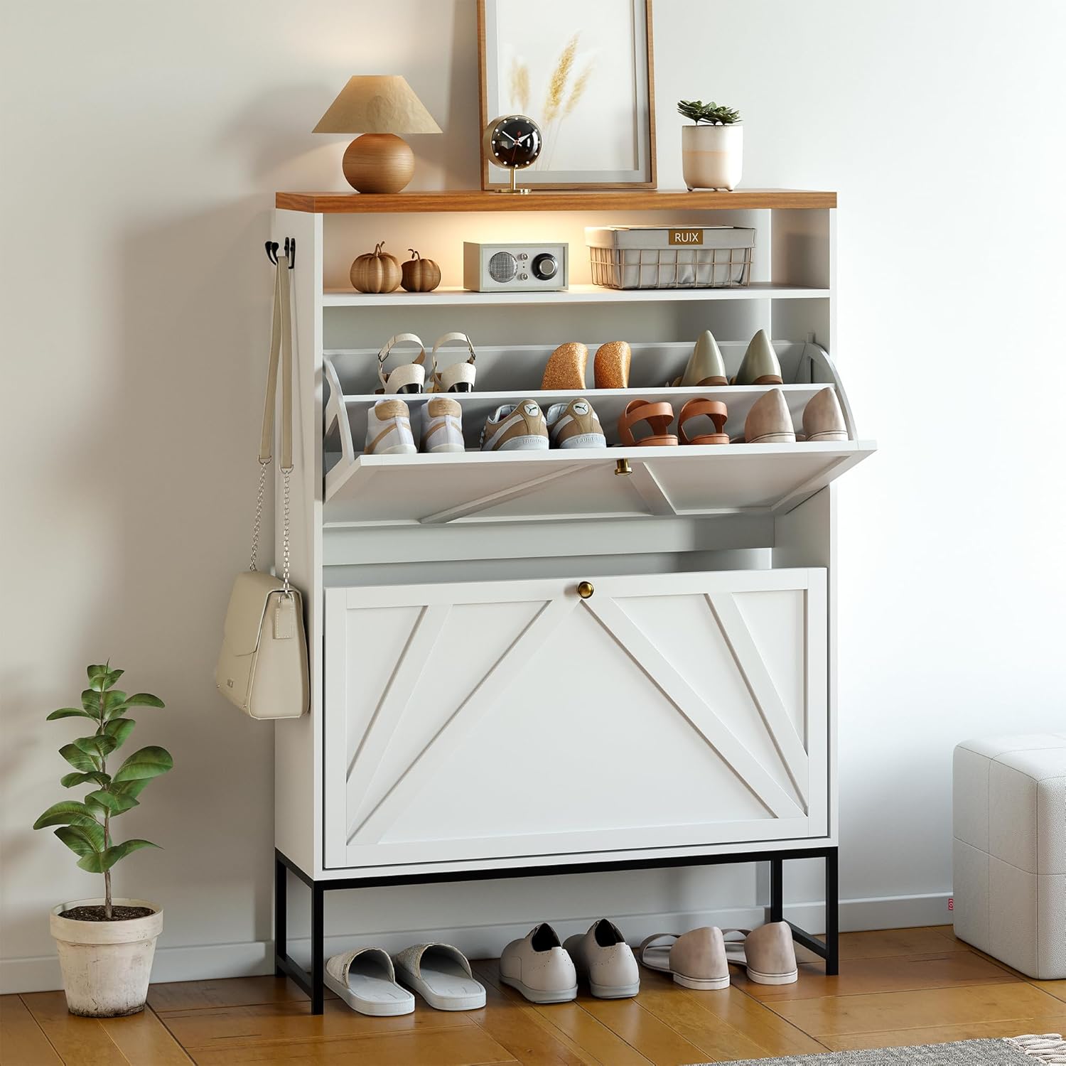 Shoe Storage Cabinet with 2 Flip-Up Doors, Freestanding Hidden Shoe Storage Organizer with Open Storage & Hooks, Narrow Wooden Entryway Shoe Rack for Front Door Entrance, Hallway, Foyer, Rustic Brown